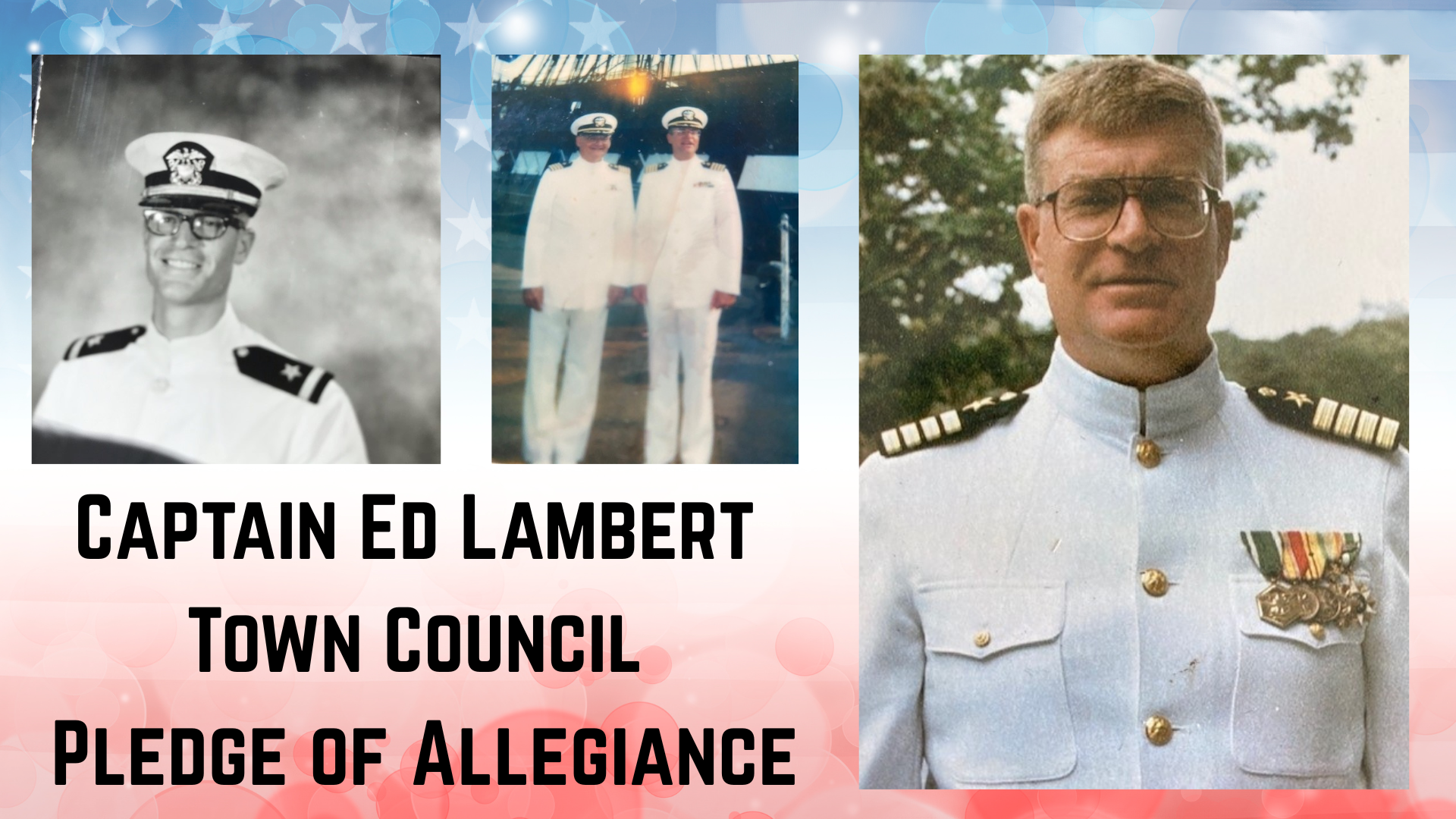 Town Councilor Betty Ludtke welcomed Captain Ed Lambert to lead the Pledge of Allegiance. Captain Ed Lambert retired from the United State Navy after 29 years of active and reserve service. As a Naval Intelligence Officer, his career encompassed duties on both the east and west coasts, and extensive operations in the Pacific Theater. Captain Lambert served with various commands in many aspects of Fleet Operational Intelligence. After three different Command tours, he retired from the USS Constitution – Old Ironsides.